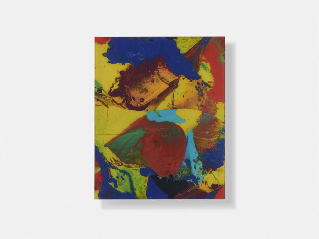 2010. ‘Bagdad’ is a work behind glass, produced by first pouring bold colours of enamel paint onto a